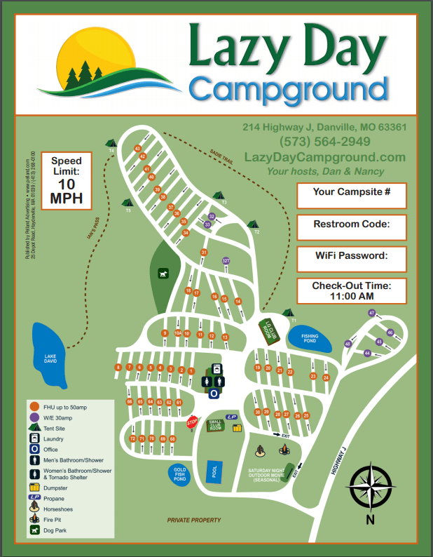 Lazy Day Campground is family owned and operated, situated in a serene natural setting far from the hustle and bustle, but conveniently located 1.5 miles from I-70 between St. Louis and Columbia with Kansas City just a little further to the west. We are the perfect destination for a quiet and relaxing weekend or that much needed rest from the long traveling roads.